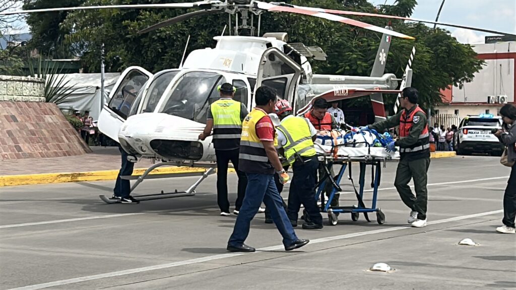 La tarde de este lunes, la ambulancia aérea aterrizó en la Calzada Porfirio Díaz a un costado de la Fuente de las 8 regiones, donde paramédicos esperaban a la persona identificada como Guadalupe M.T de 48 años de edad que fue ingresada de manera inmediata al Hospital Civil.