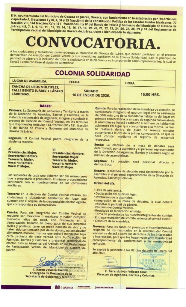 Oaxaca de Juárez, Oax. 6 de diciembre de 2026. Con el objetivo de fortalecer la participación ciudadana y la organización comunitaria, el Municipio de Oaxaca de Juárez, a través de la Secretaría de Gobierno y Territorio y la Dirección de Barrios y Colonias, emitió nuevas convocatorias para la renovación de Comités Vecinales y sus Comisiones Auxiliares en diversas colonias de la capital.