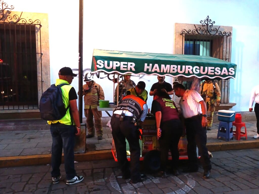 De manera coordinada con Protección Civil y el Heroico Cuerpo de Bomberos, se atendió un incidente registrado en la calle Morelos, esquina con García Vigíl, donde se detectó una fuga de gas en un carrito de venta de alimentos.