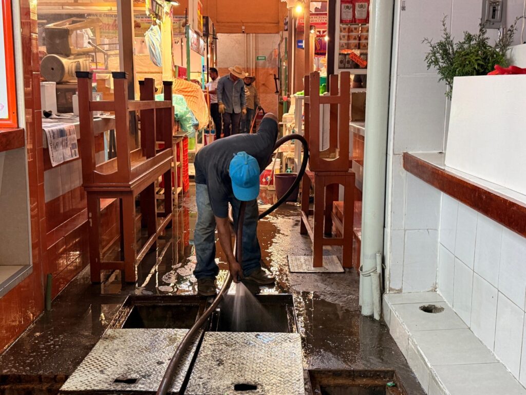 Oaxaca de Juárez, Oax. 12 de noviembre de 2025.Con el objetivo de mantener en óptimas condiciones las instalaciones del Mercado 20 de Noviembre y garantizar un entorno limpio y seguro para comerciantes y visitantes, la Secretaría de Gobierno y Territorio, a través de la Dirección de Mercados y en coordinación con el Sistema Operador de los Servicios de Agua Potable y Alcantarillado (SOAPA), llevó a cabo trabajos de desazolve y mantenimiento preventivo en el sistema de drenaje del mercado.